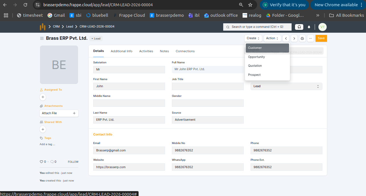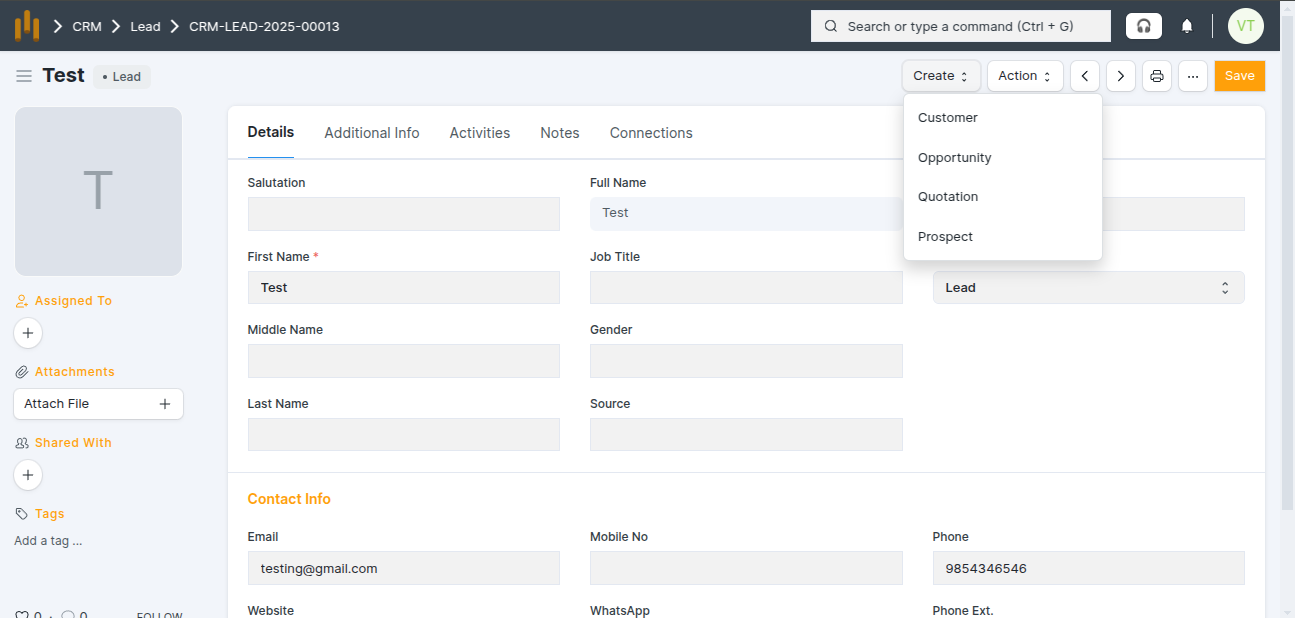 When the Customer button is clicked in the Lead form, the system automatically creates a Customer using the Lead details.