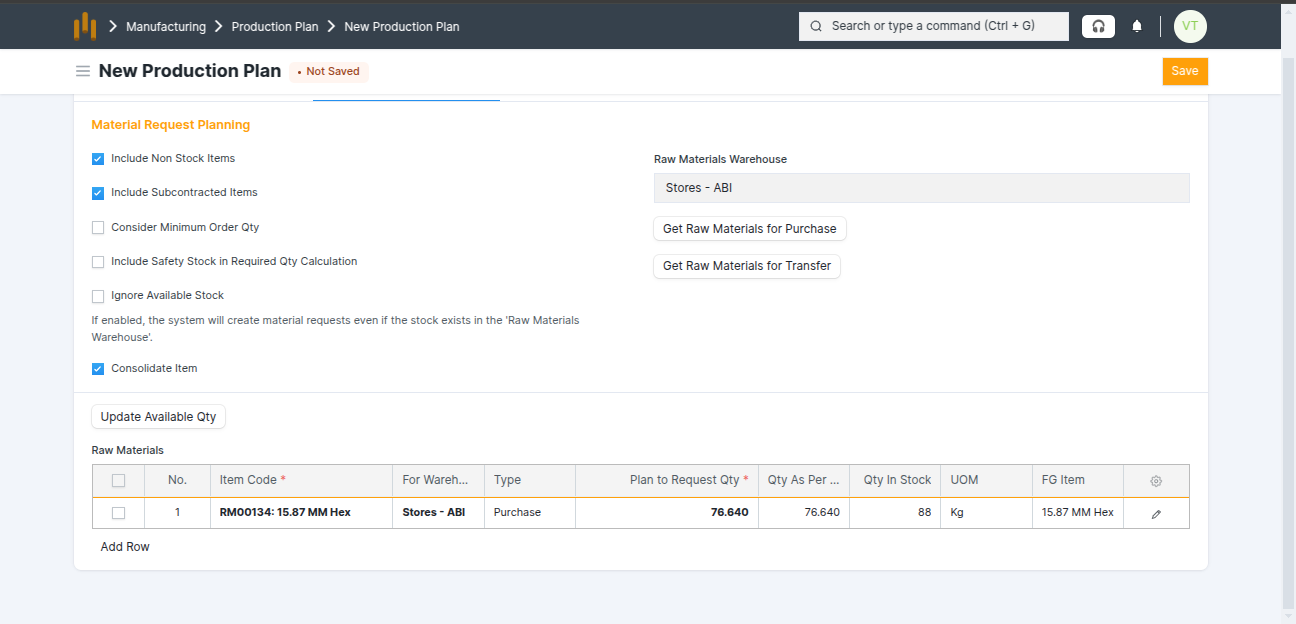 - Raw Materials items table show the Raw Materials items details: Item Code, For Warehouse, Type, Plan to Request Qty, Qty As Per BOM, Qty In Stock, UOM, FG Item
