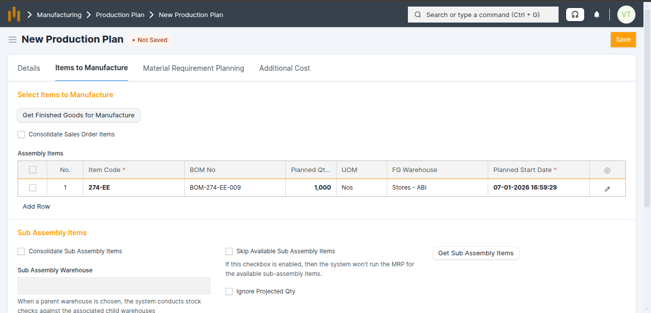- Assembly items table show the Finish good details: Item, Bom No, UOM , FG Warehouse, Planned Qty and Planned Start Date
