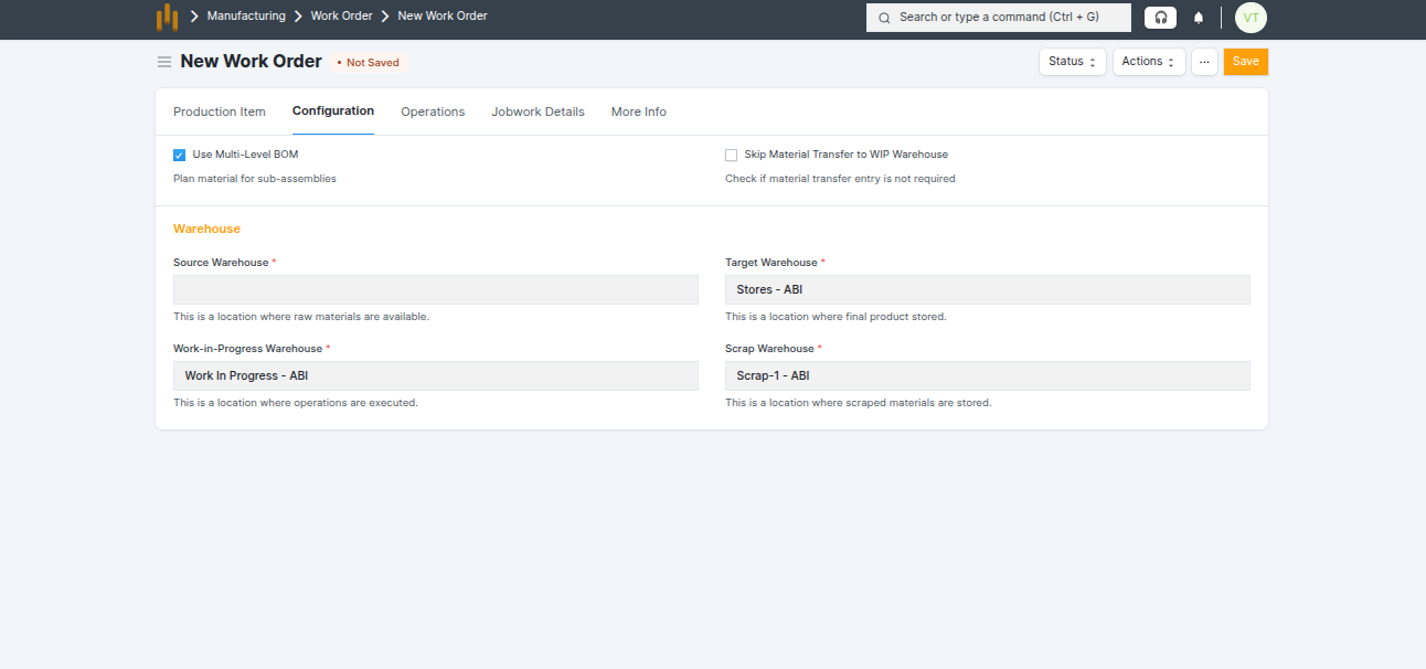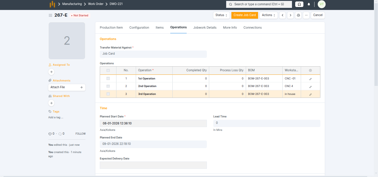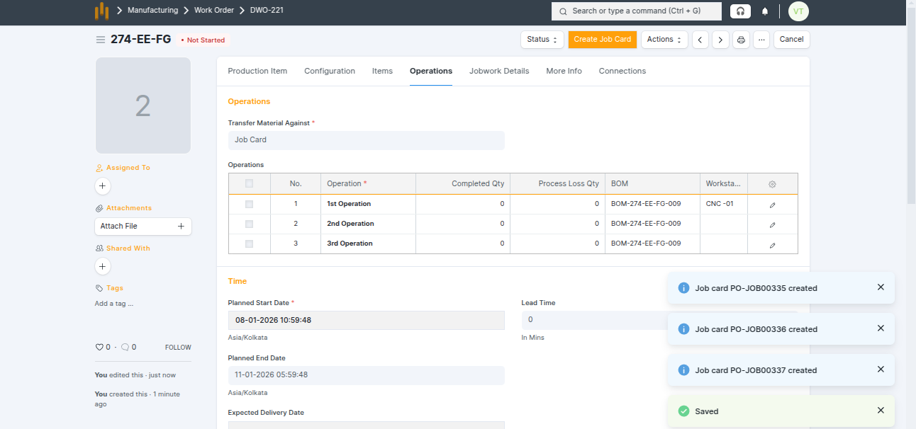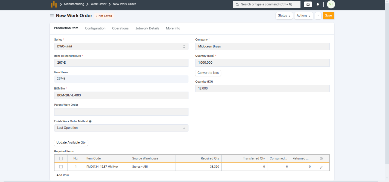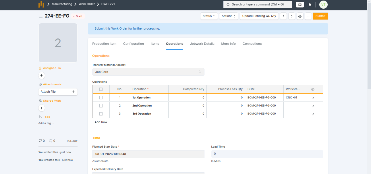 - If the BOM contains Operations, they are automatically fetched into the Work Order.