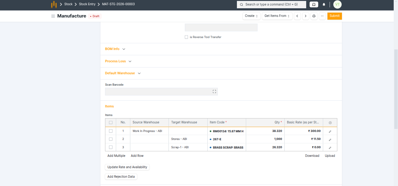 - Raw material is transferred from the Stores warehouse to the WIP warehouse . All item details are shown in the Items table, including Source Warehouse, Target Warehouse, Item Code, Quantity, and UOM. Save and Submit the Stock Entry.