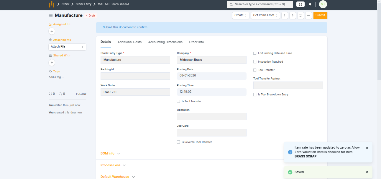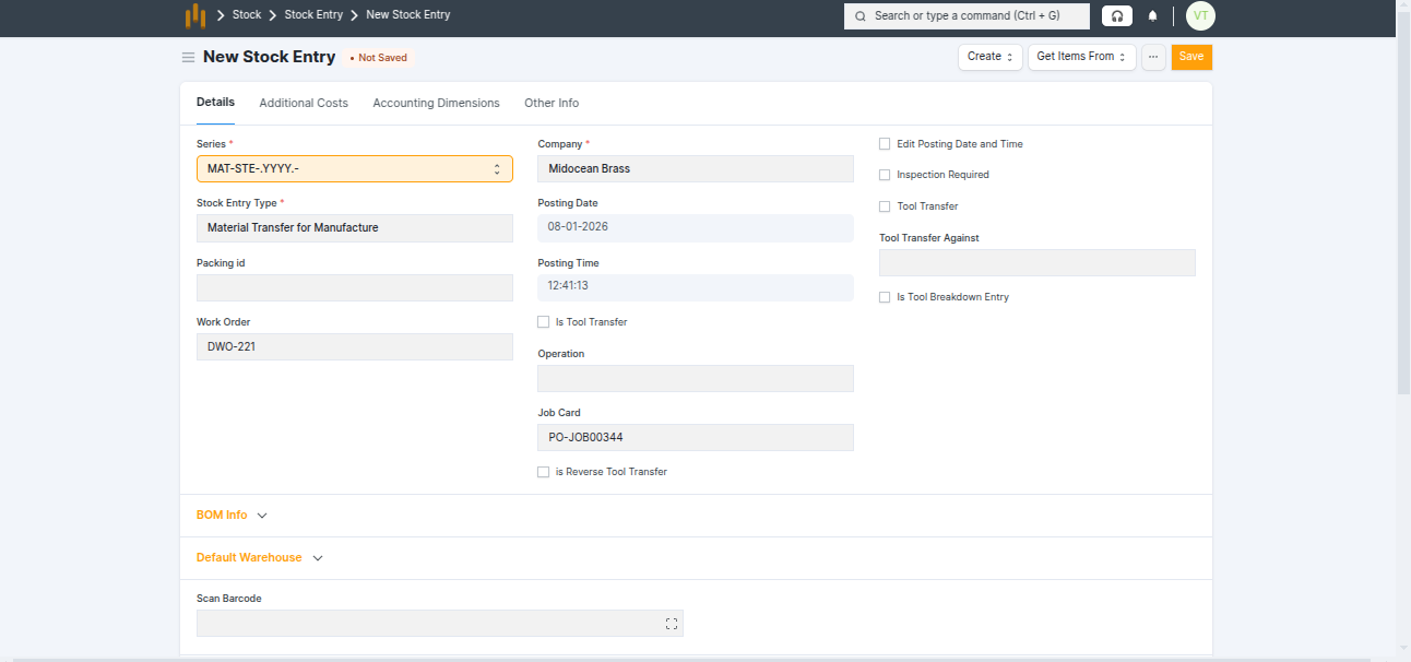 - All details are displayed, such as Stock Entry Type, Posting Date, Time, Job Card No, and Work Order No.