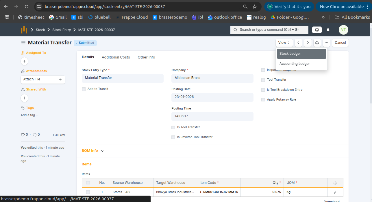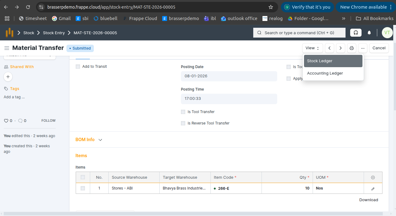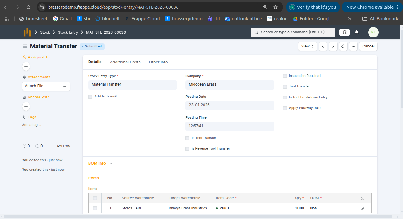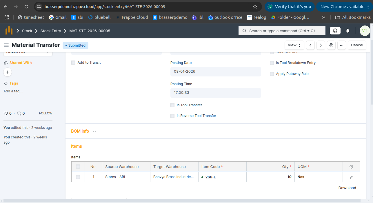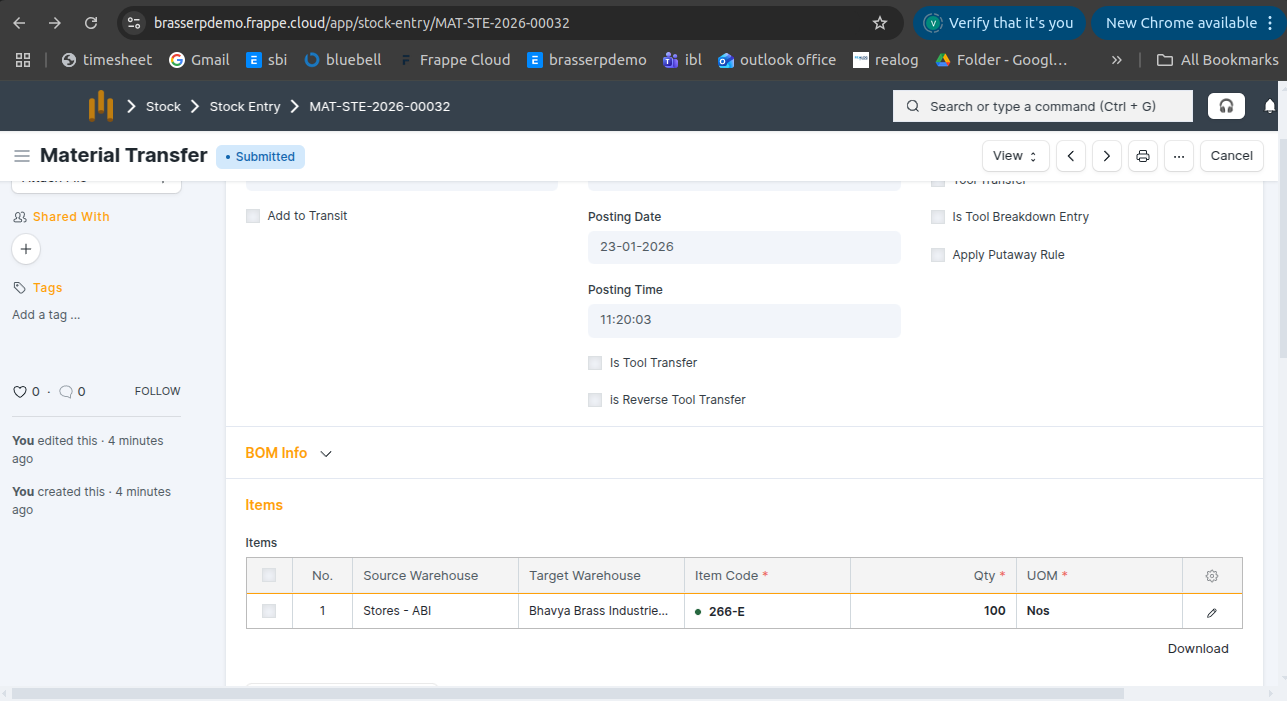 Step-4 : Save and Submit the form.On submission, a Stock Entry is automatically created for Material Transfer .