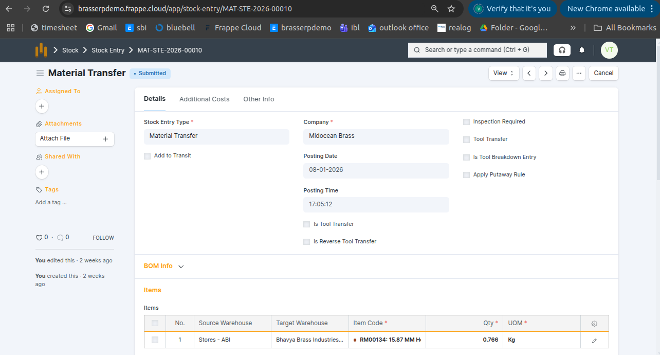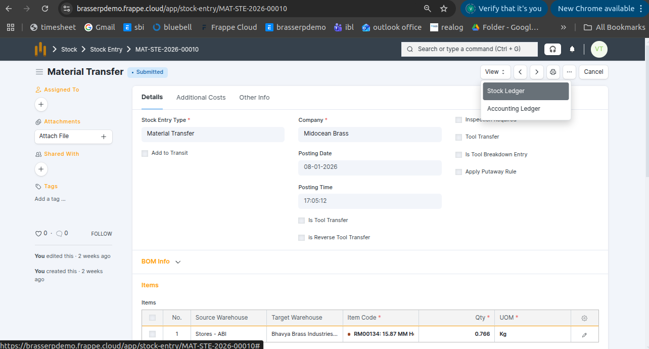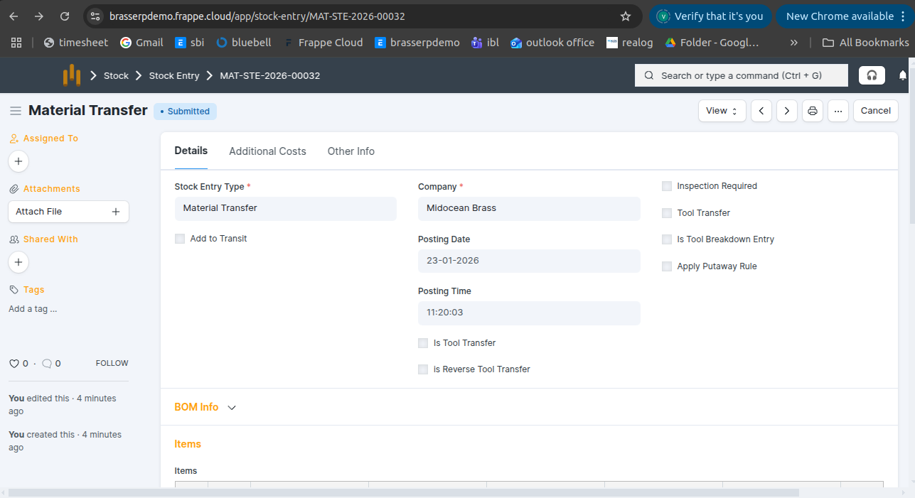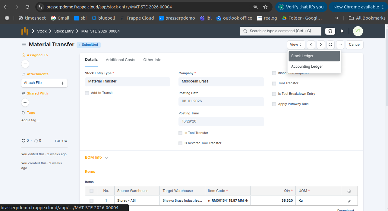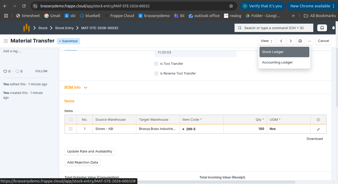Step-4 : Save and Submit the form.On submission, a Stock Entry is automatically created for Material Transfer .