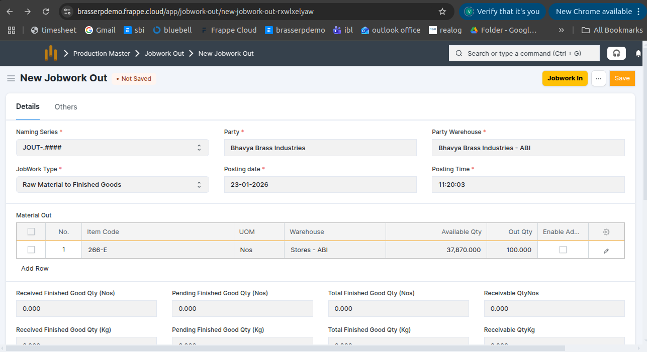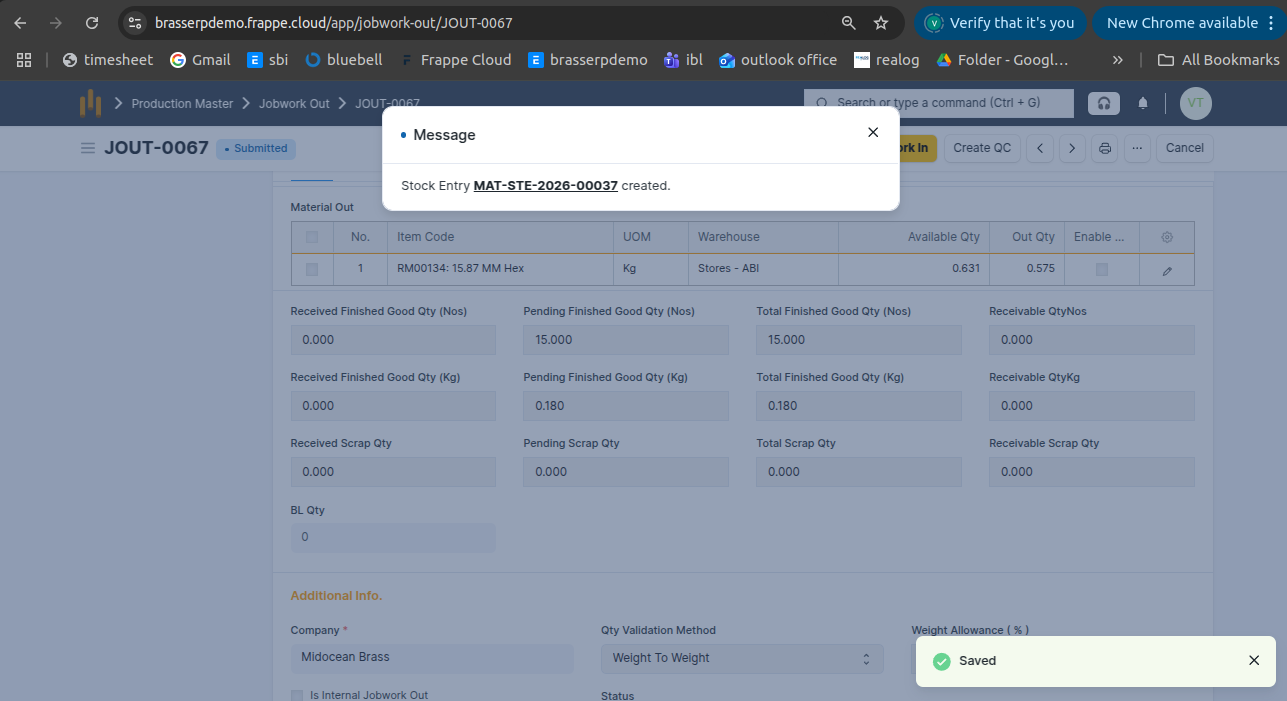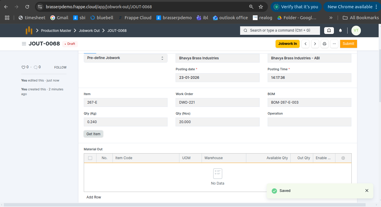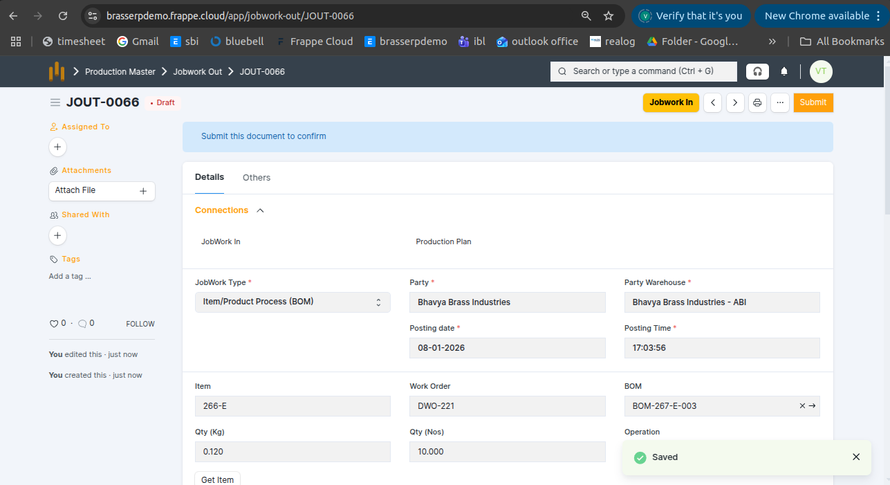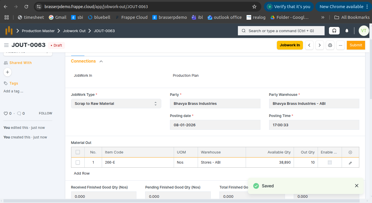 - Jobwork Out is created in Draft status.