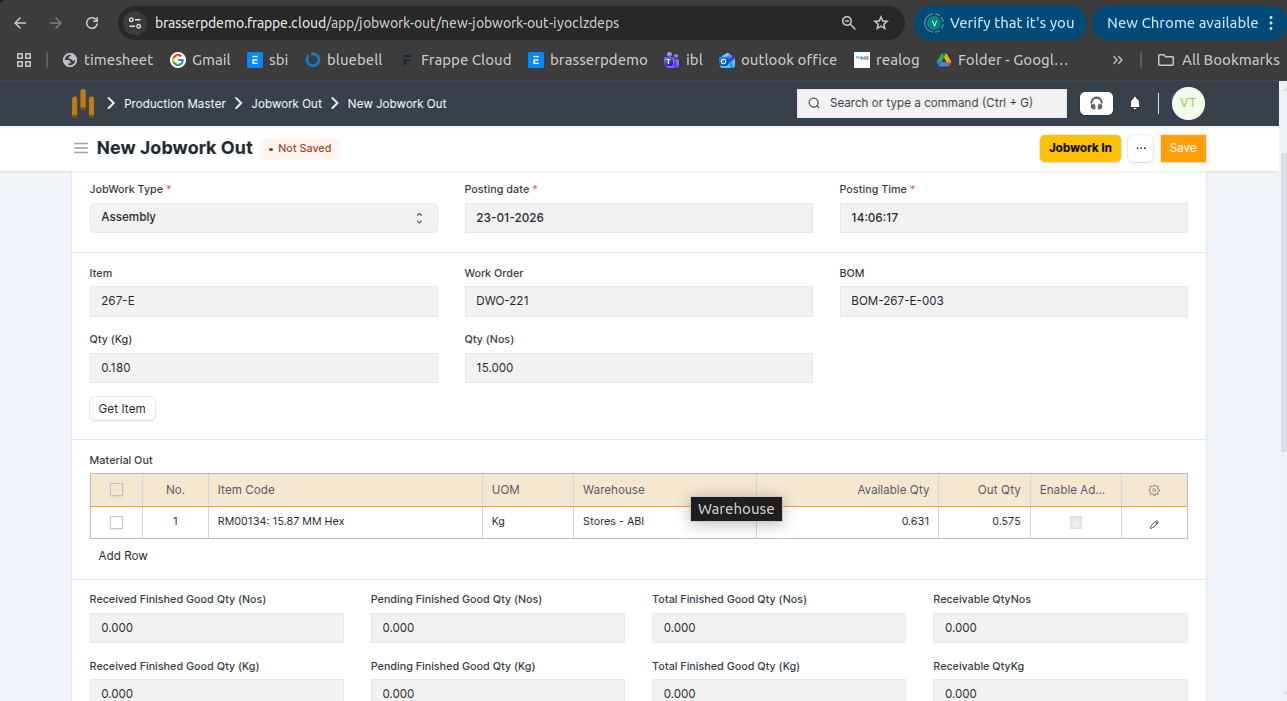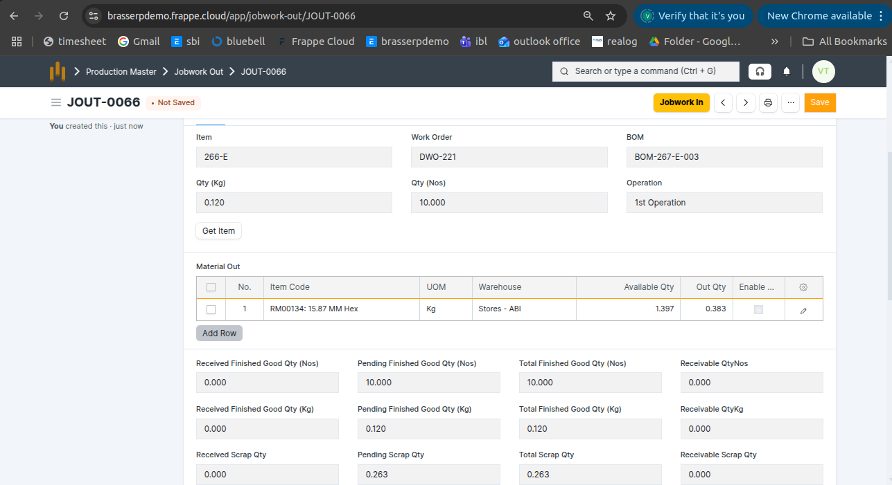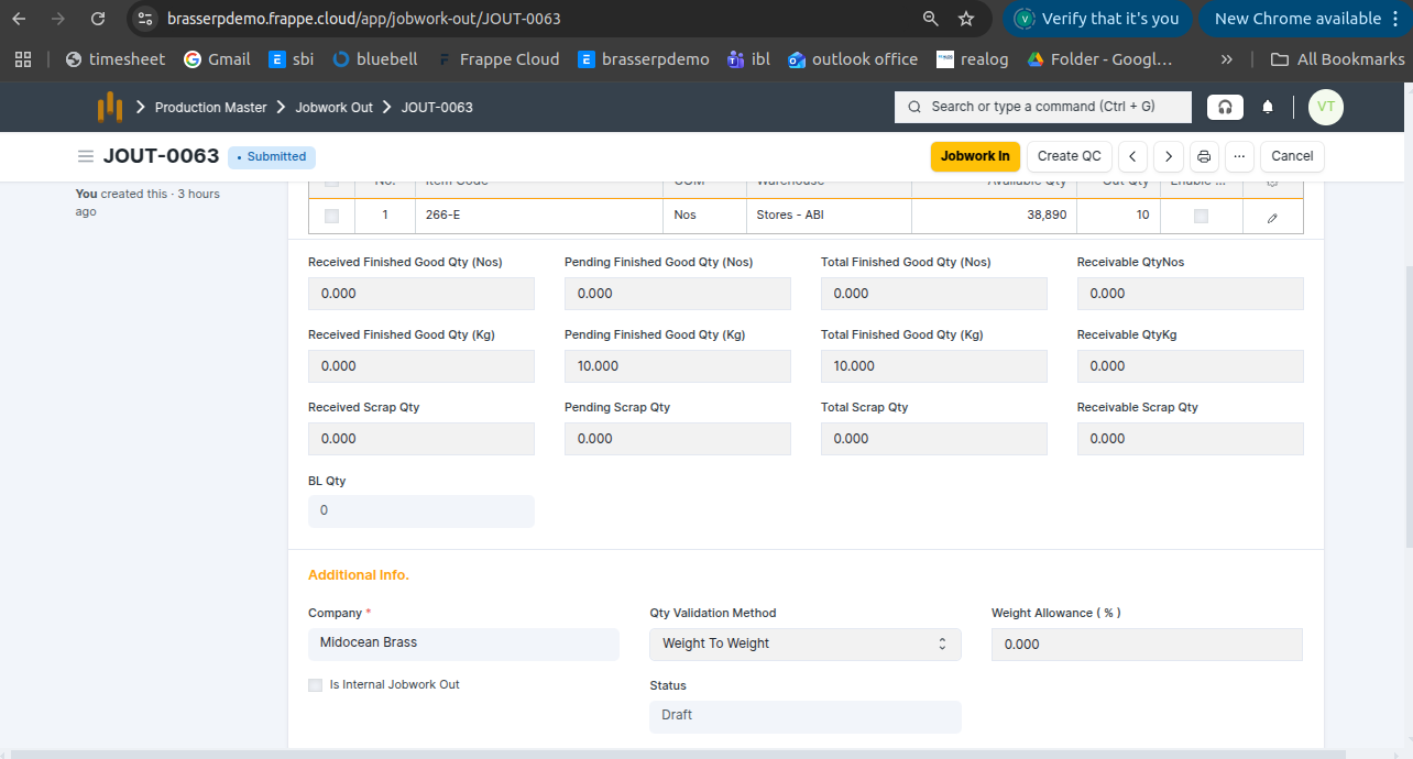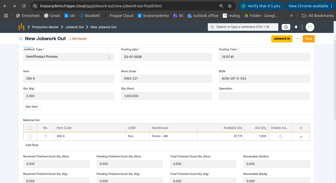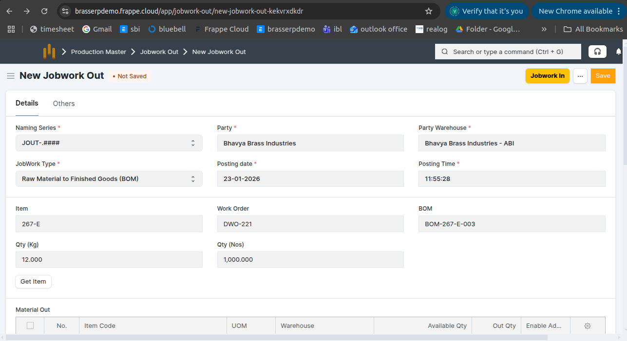 - Jobwork Out is created in Draft status.