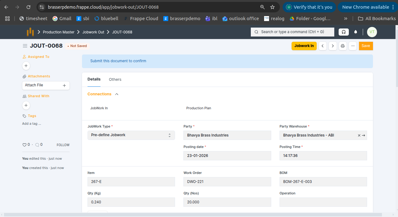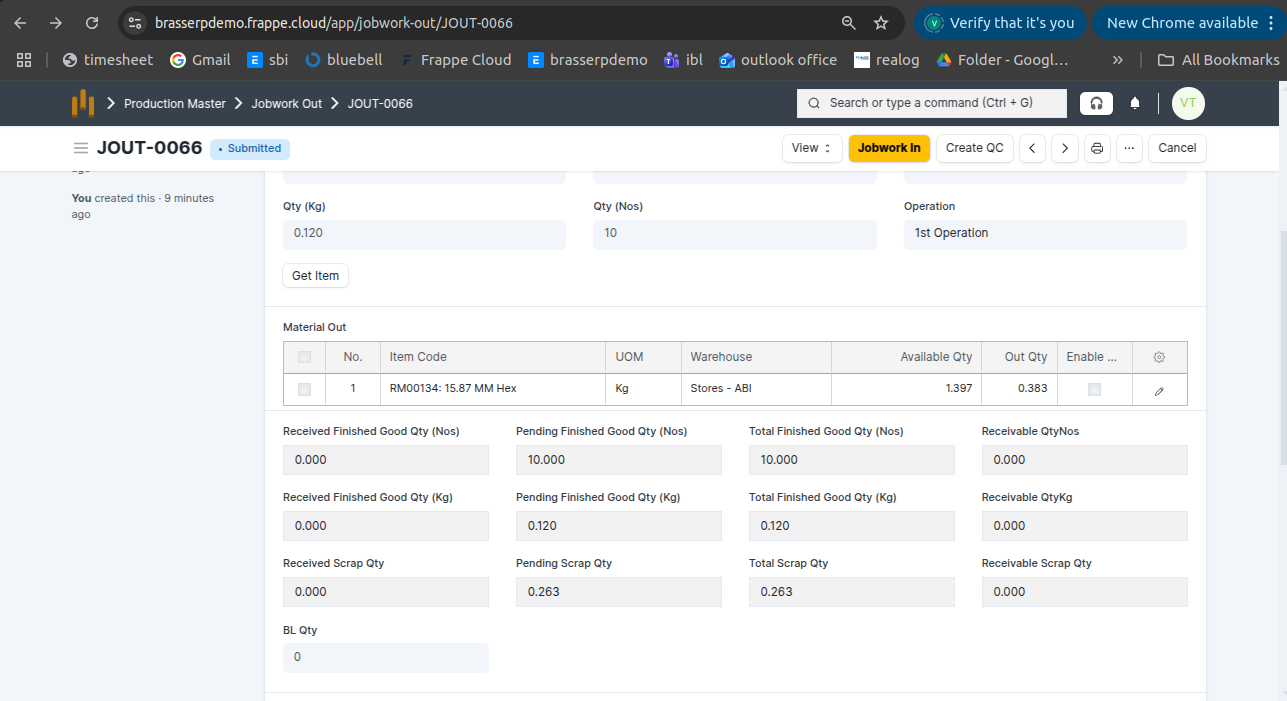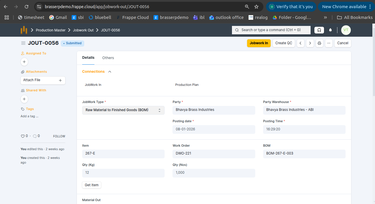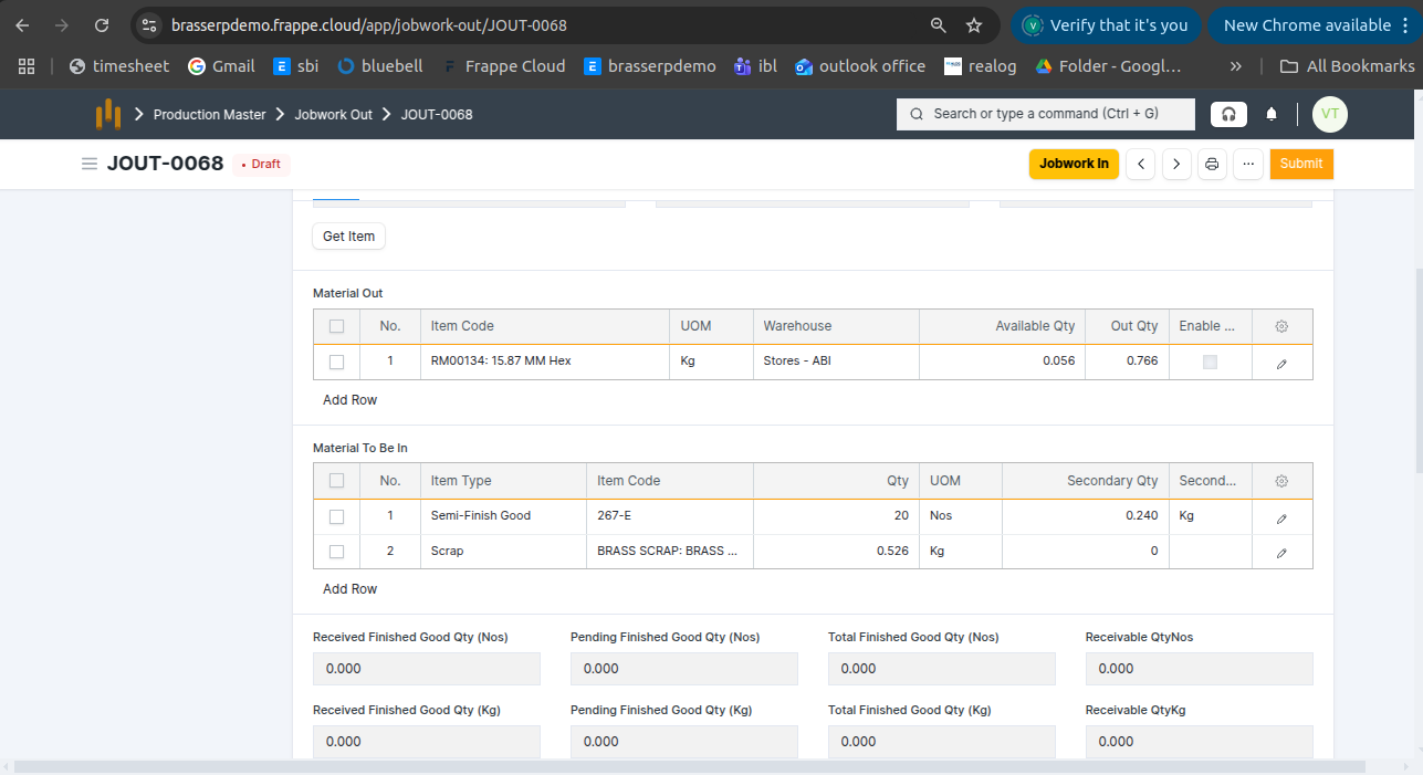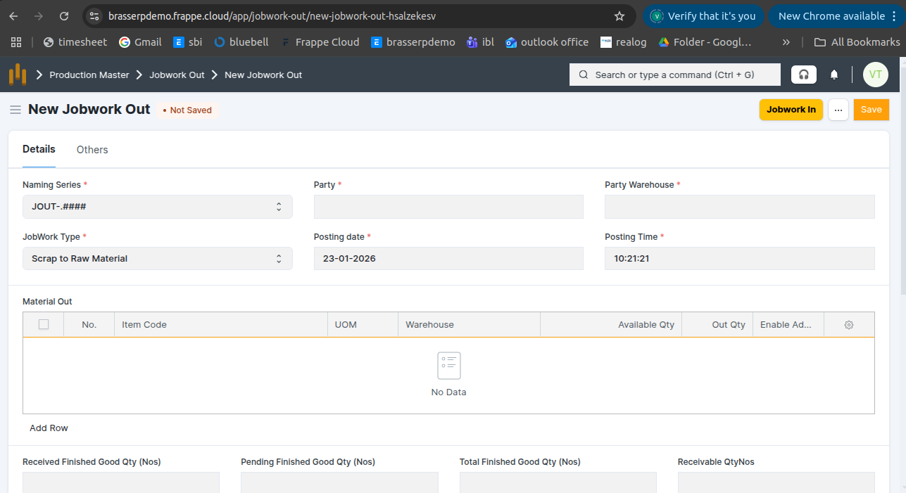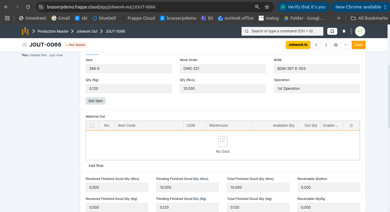 - Jobwork Out is created in Draft status.