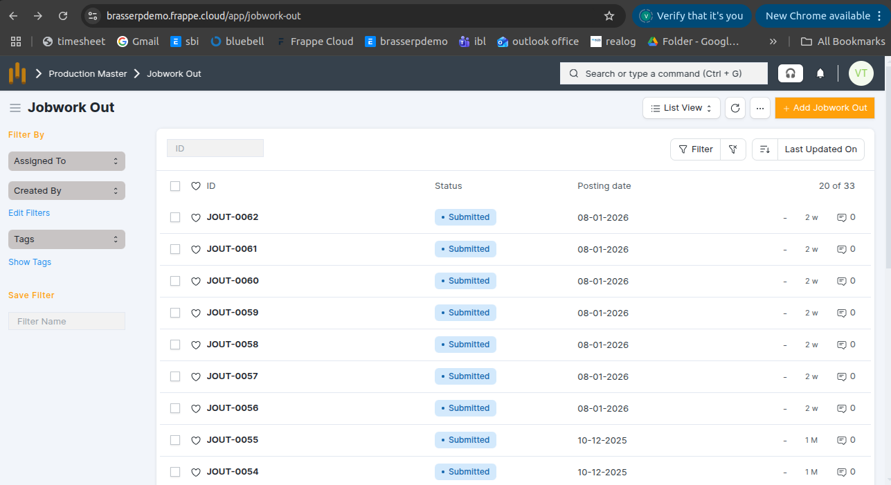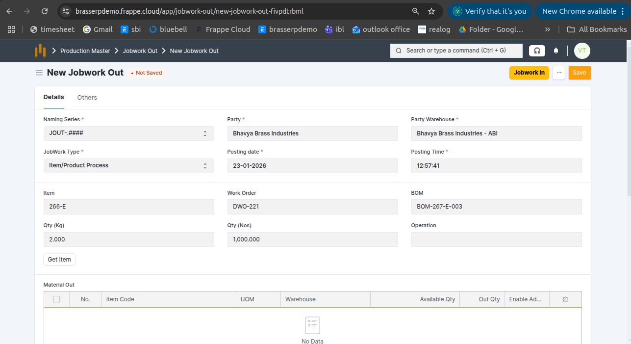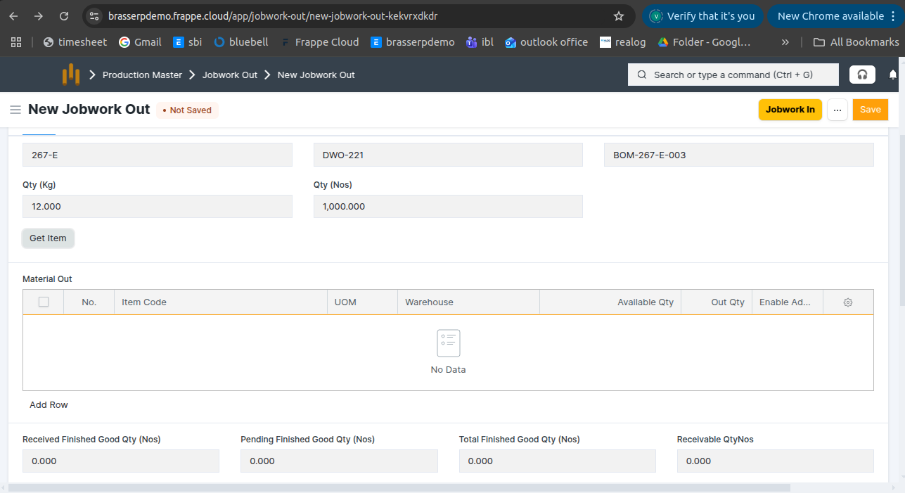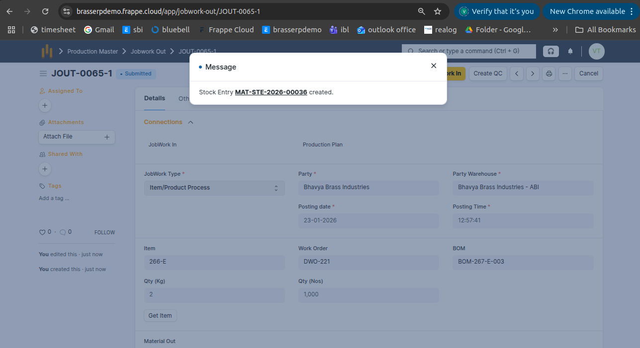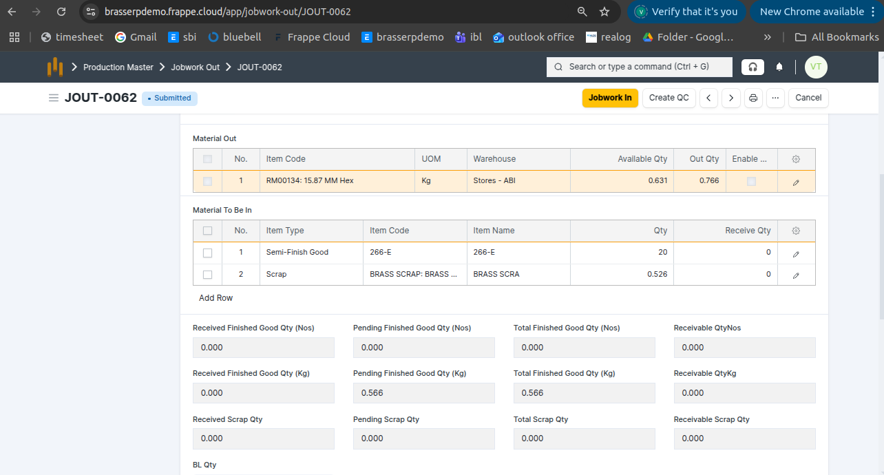- Jobwork Out is created in Draft status.