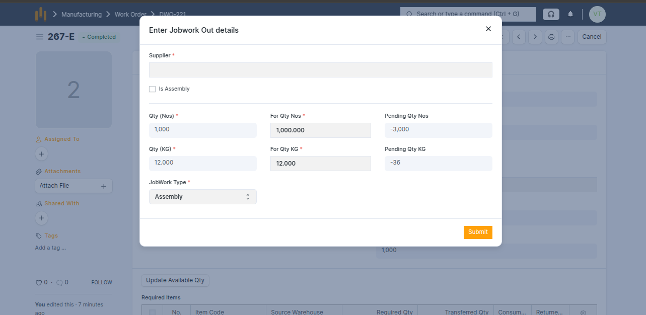 - Select Supplier and other details are auto-fetched from the Work Order, such as: Jobwork Type = Assembly, Item, Quantity (Nos & Kg), Pending Qty (Nos & Kg) Then click Submit.