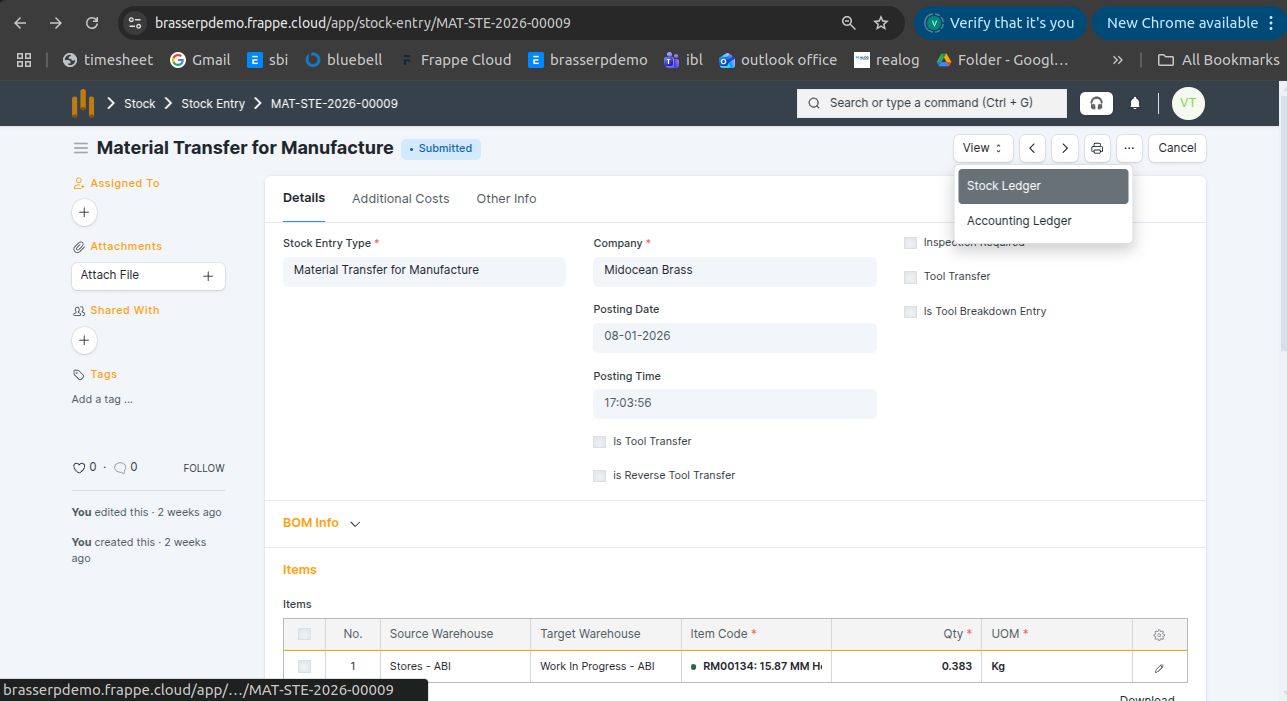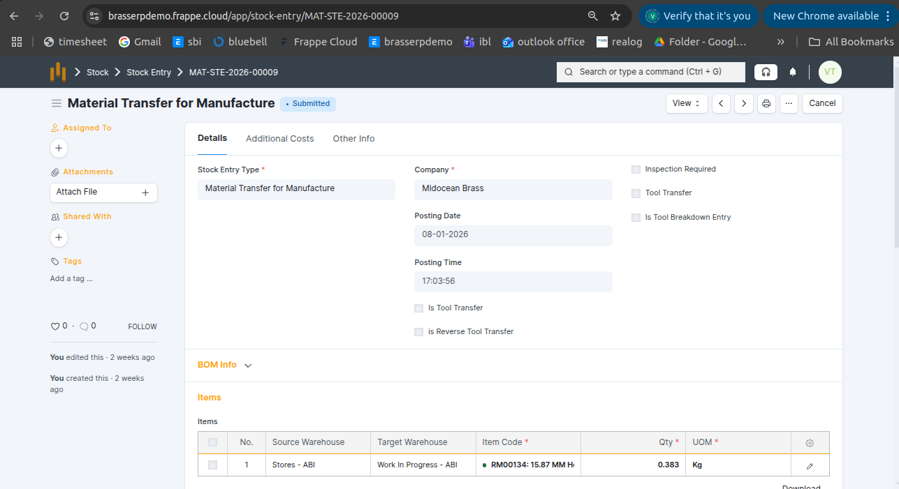 Step-4 : Save and Submit the form.On submission, a Stock Entry is automatically created for Material Transfer for Manufacture .