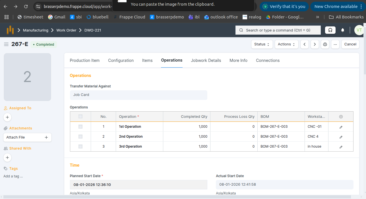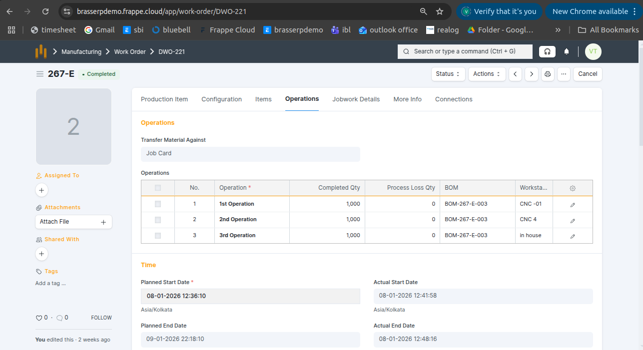 - A Work Order was created for 1,000 Nos with 3 operations, and all operations were completed.