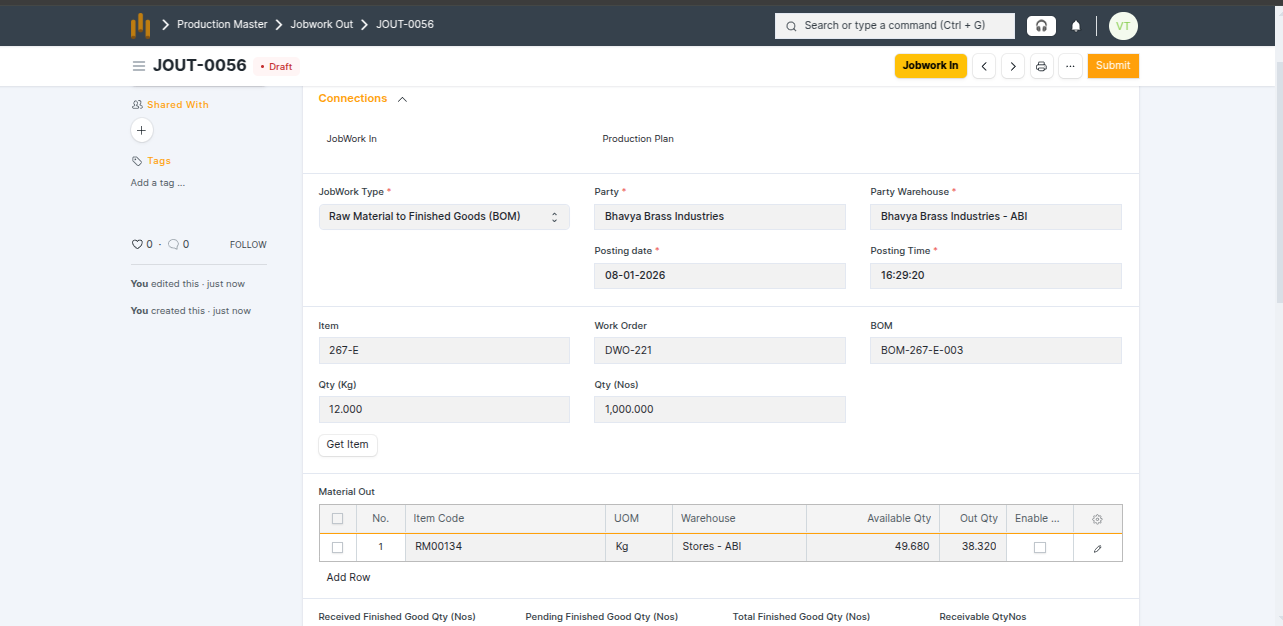 - The following details are automatically fetched : Jobwork Type = Raw Material to Finished Goods – BOM , Party (Supplier) and Party Warehouse , Item, Posting Date & Time , Work Order No. and BOM No. , Quantity (Nos & Kg), Material Out table