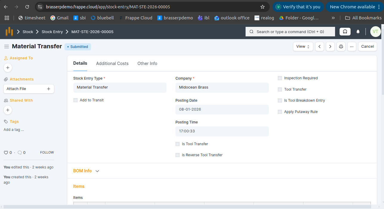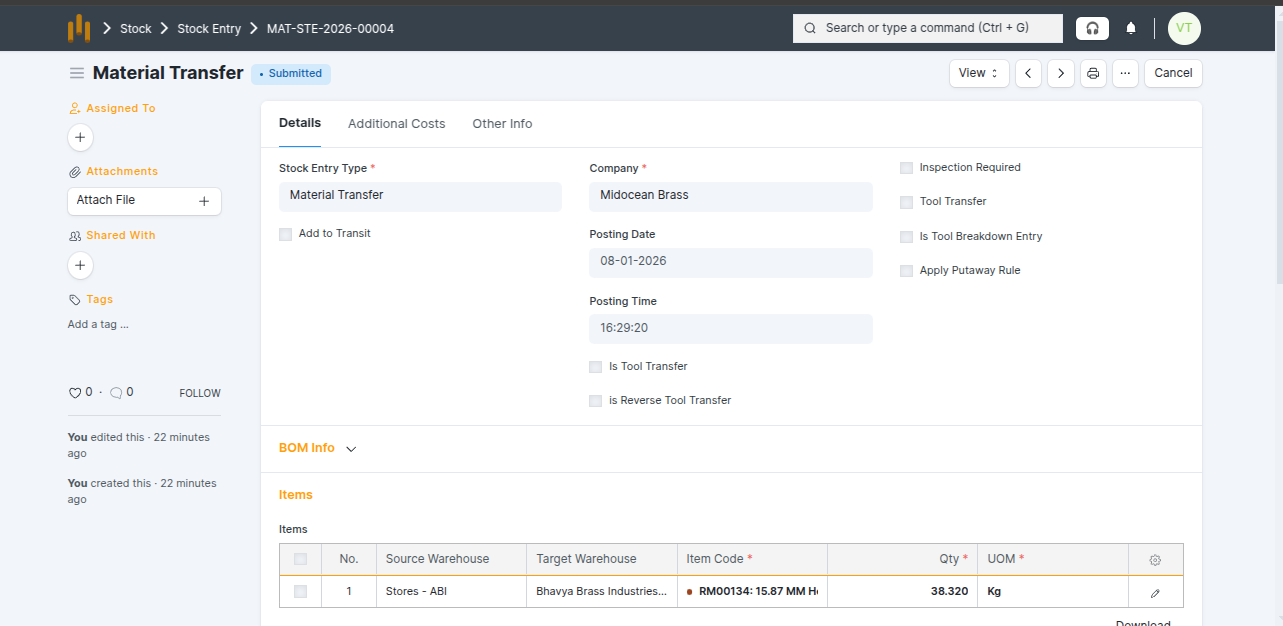 - After submitting Jobwork Out, the system automatically creates a Stock Entry with type Material Transfer.