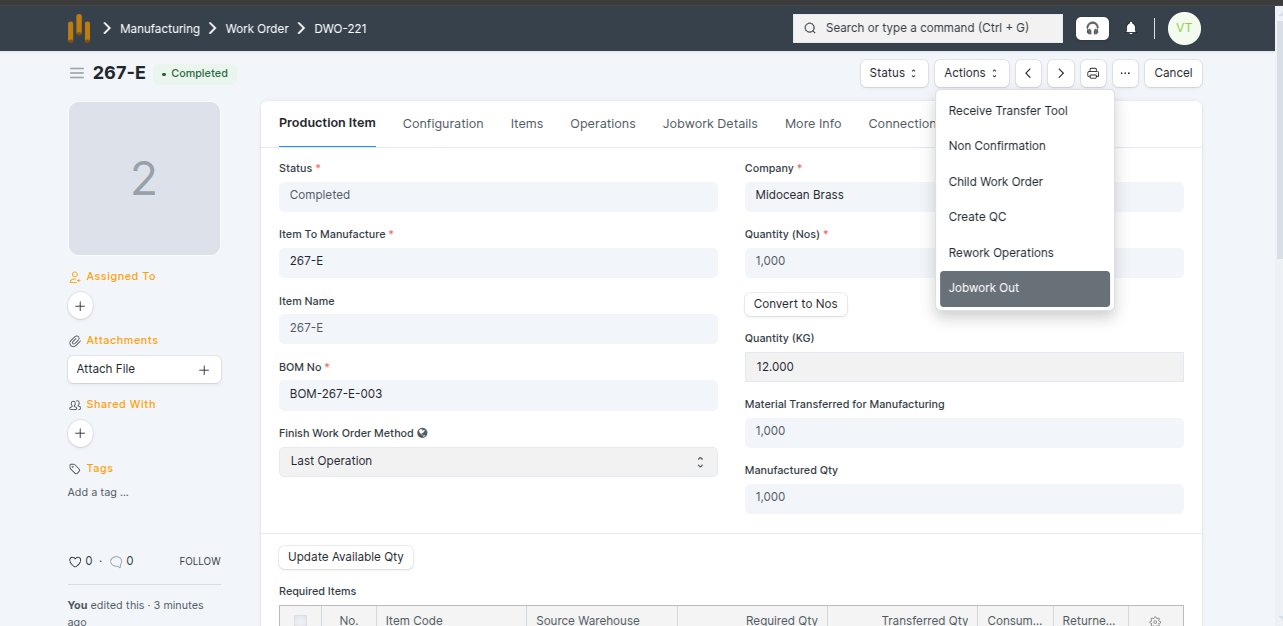 - Go to the Work Order and click the Jobwork Out button after the work order is completed.