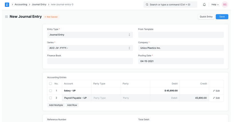 - Reference Type: If this Accounting Entry is associated with another transaction, it can be referenced here. Select the Reference Type and select the specific document. For example, if you're creating a Journal Entry against a specific Sales Invoice. Link this Journal Entry to the invoice. The “outstanding” amount of that invoice will be affected.