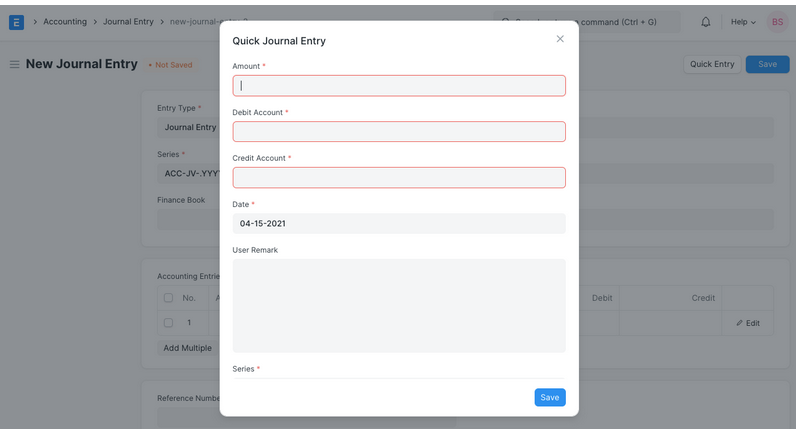 - When creating a Journal Entry, a Quick Entry button can be seen on the top right. This makes creating the Journal Entry a bit easier. Enter the amount, select the accounts, add a remark. This will populate the 'Accounting Entries' table with the selected details.