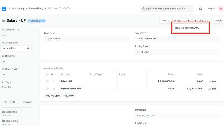 - Clicking Reverse Journal Entry on a submitted Journal Entry creates a new Journal Entry by reversing debit and credit amounts.