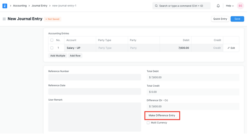 - The Difference is the remaining amount after summing all debits and credits. To submit the Journal Entry, this should be zero. Click Make Difference Entry to automatically add a row to adjust the total.