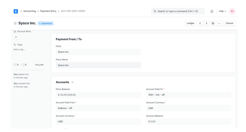 - The Account Paid To and Account Paid From will be fetched as set in the Company form.
