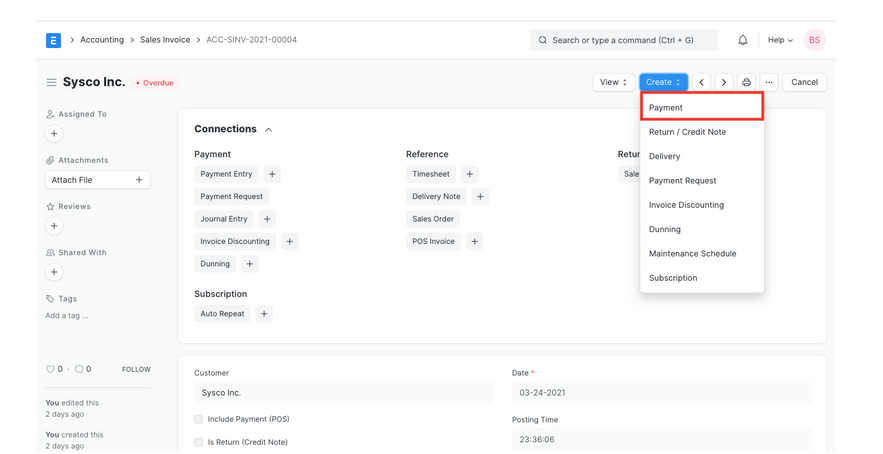 - On submitting a document against which Payment Entry can be made, you will find the Payment option under the Create button.
