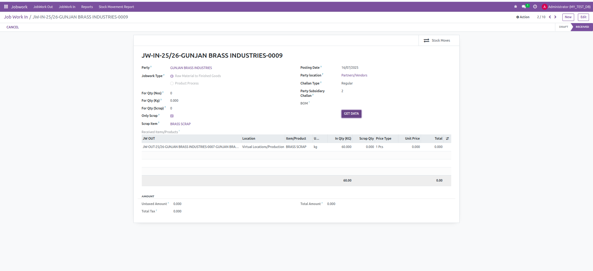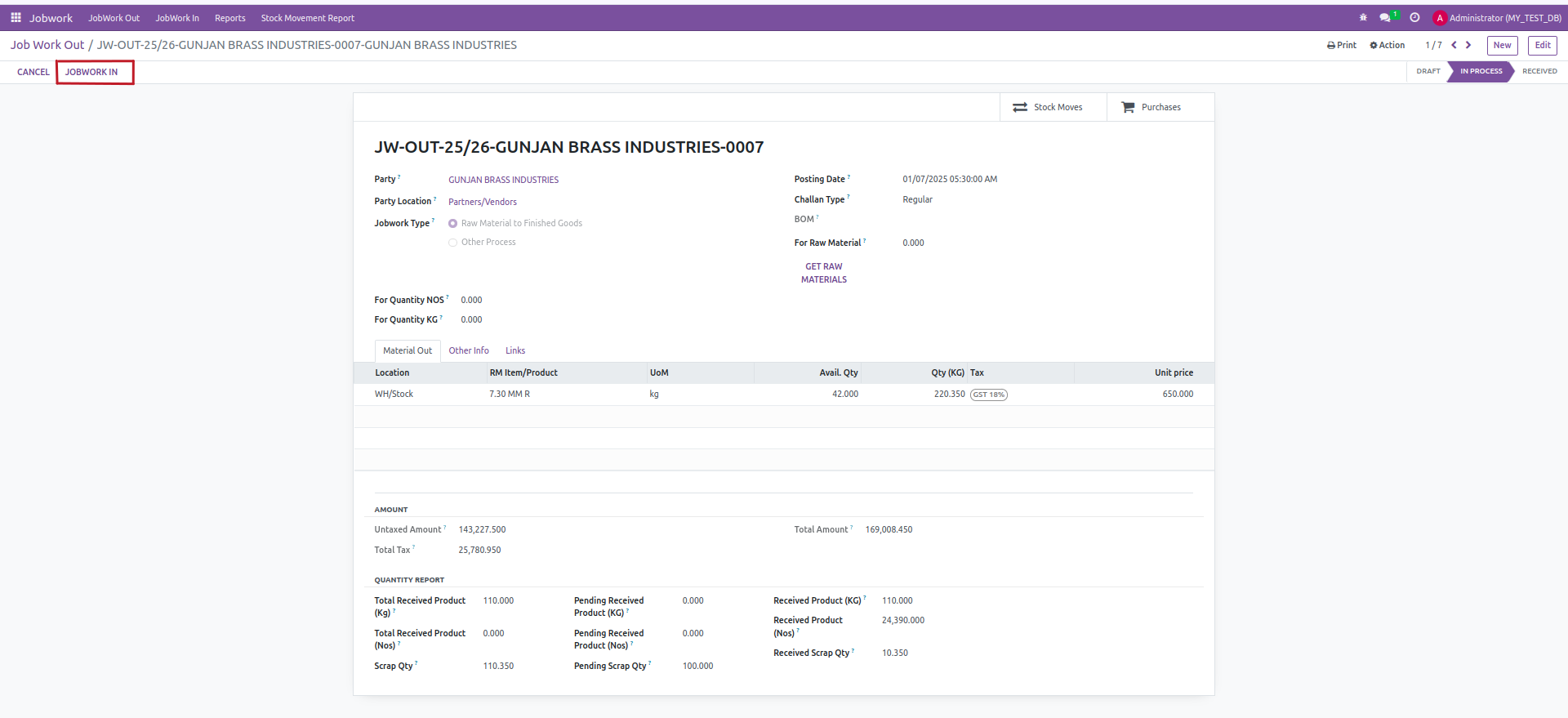 - party, party location etc. will fetch auto from JobWork Out, add received items and quantities, confirm to update corresponding JW Out pending quantities.