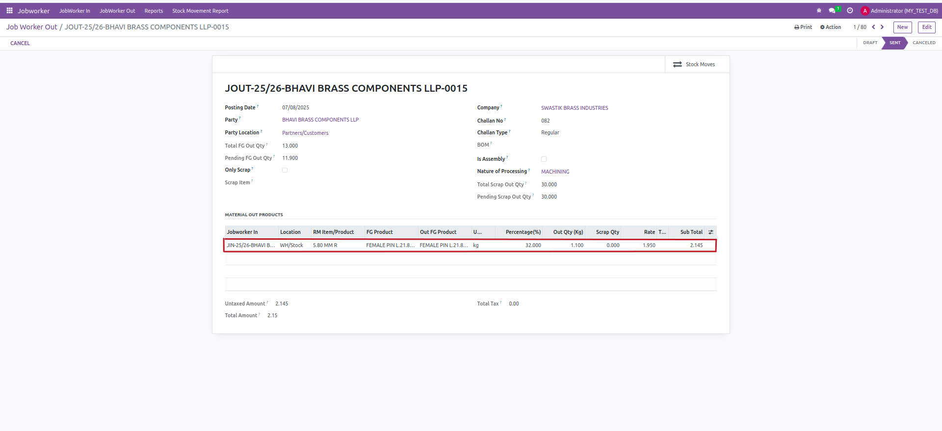 Jobworker In → Click JobWorker Out button) to create out challans for FG/scrap